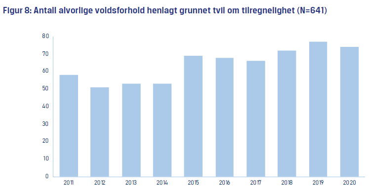 - Over en tiårsperiode ble 641 alvorlige voldsforhold – inkludert vold i nære relasjoner og vold med dødelig utgang – henlagt på samme grunnlag.