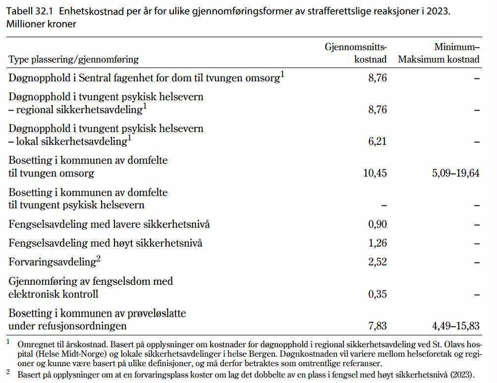 Per 31.12.2024 var det 31 personer på dom til tvungen omsorg, og 367 personer på dom til tvungent psykisk helsevern. Med et konservativt estimat (6,21 millioner per person) tilsvarer dette rundt 2,5 milliarder kroner årlig – nesten 40 % av kriminalomsorgens budsjett.